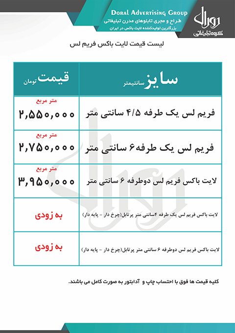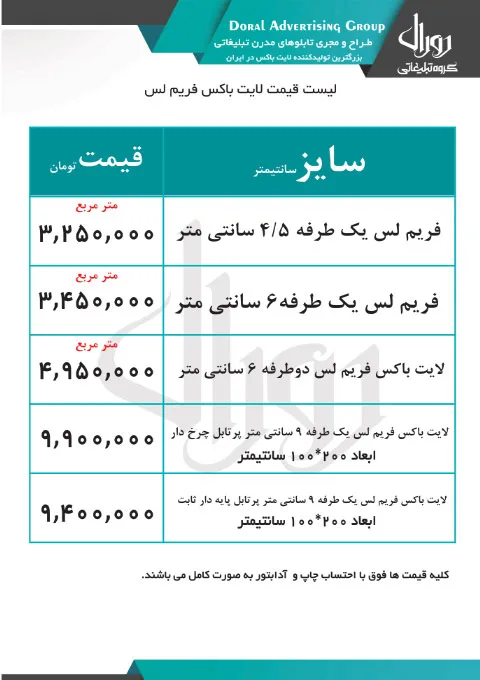 لیست قیمت تابلو لایت باکس فریم لس