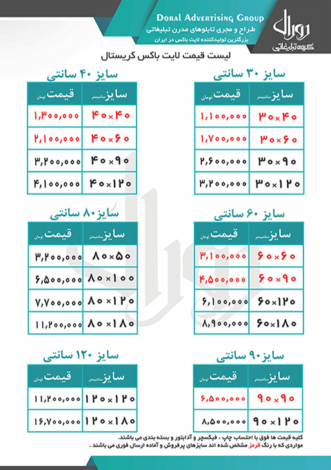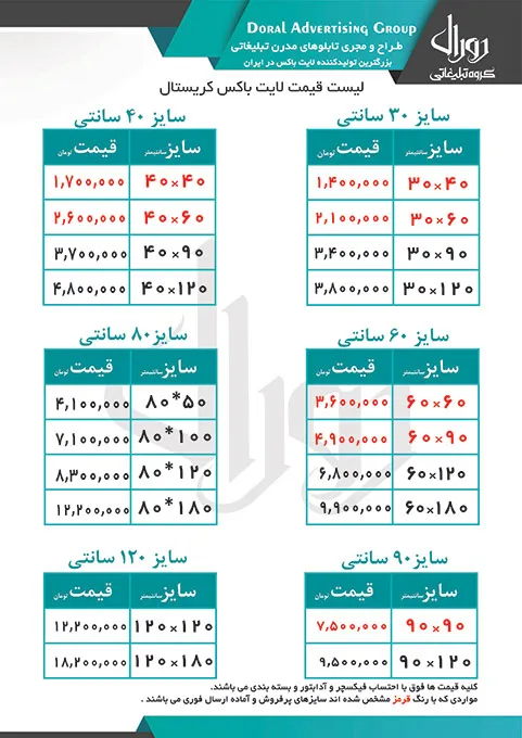 لیست قیمت تابلو لایت باکس کریستال