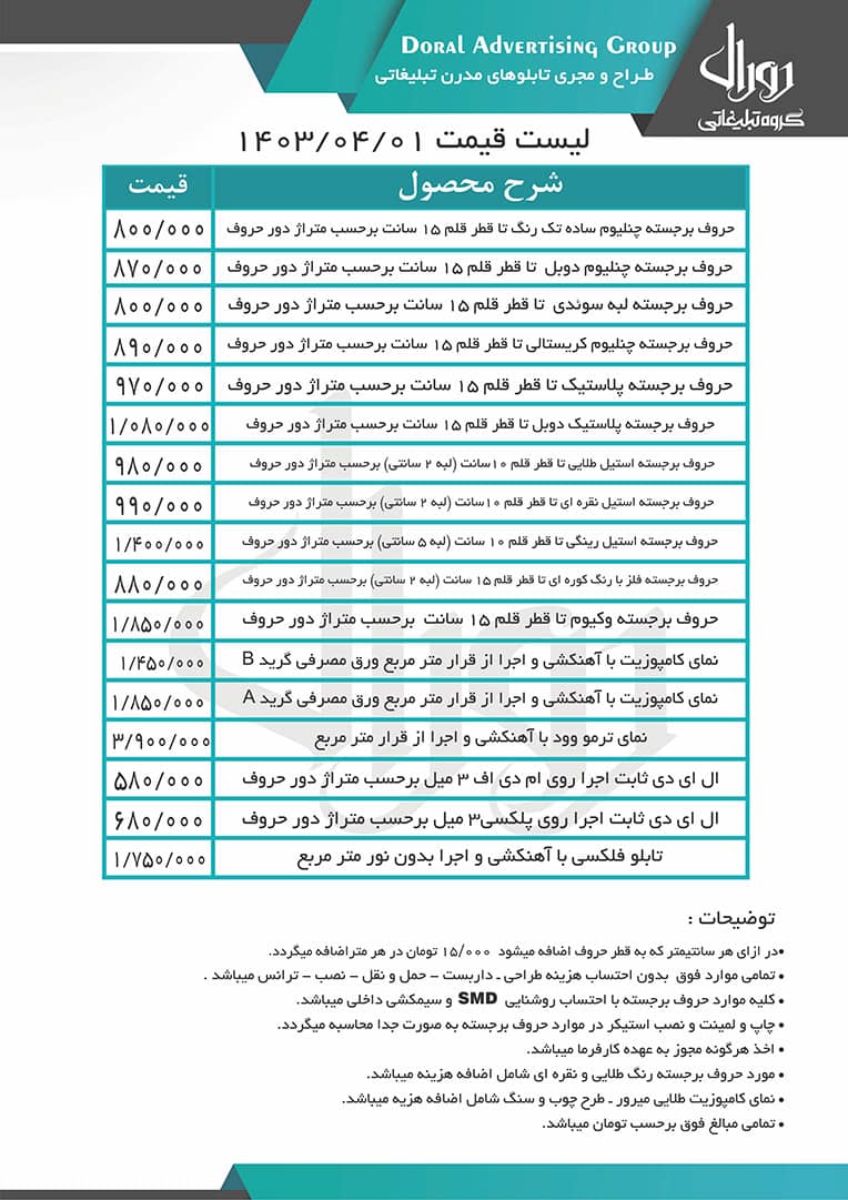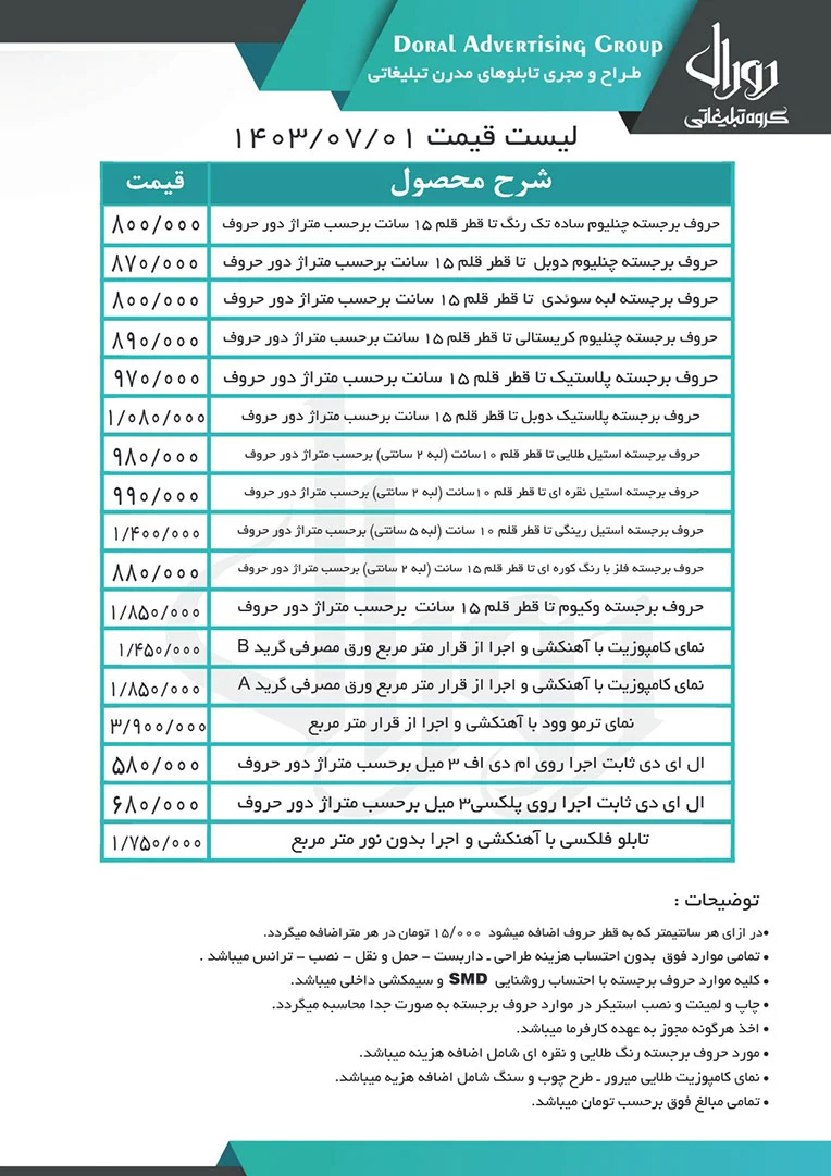 • چاپ، لیمنت و نصب استیکر در موارد حروف برجسته به صورت جدا محاسبه می گردد.