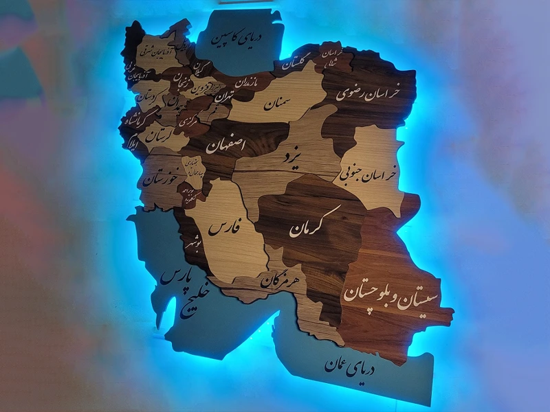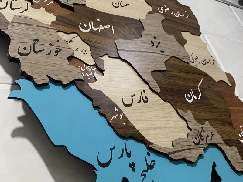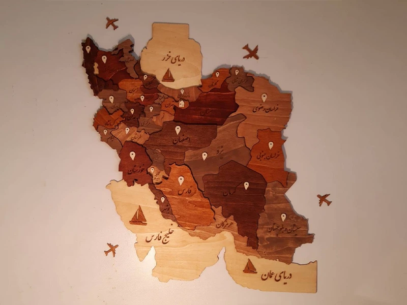 2. تابلو نقشه ایران چوبی: این مدل با استفاده از چوب طبیعی یا MDF تولید می‌شود و جلوه‌ای خاص، کلاسیک و اصیل به فضا القا می کند. مناسب دکوراسیون‌های سنتی، اداری و هنری است.