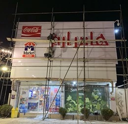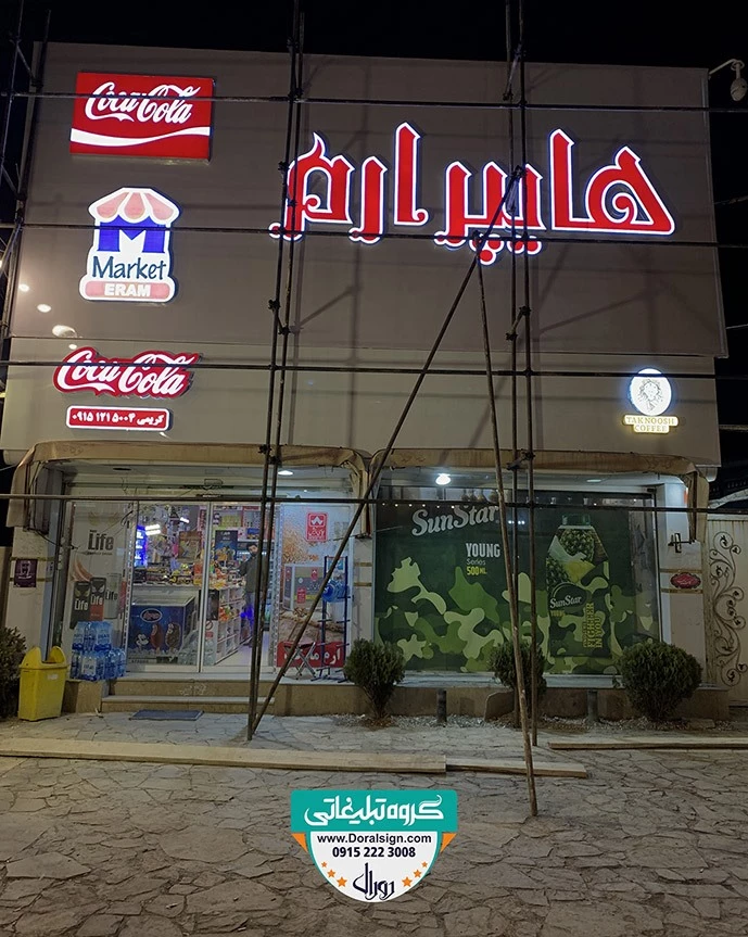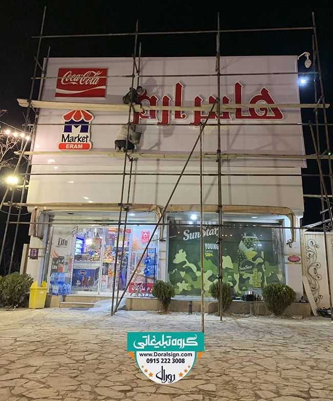 نصب و اجرای تابلو حروف برجسته چلنیوم، تابلو فلکسی برای فروشگاه ارم مارکت توسط تابلوسازی دورال