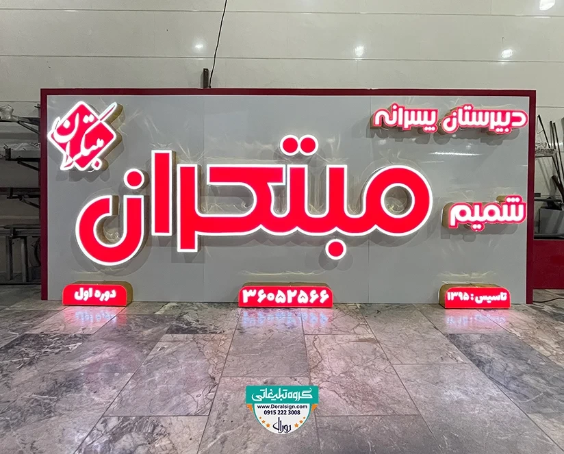 نصب و اجرای تابلو حروف برجسته چنلیوم یکی دیگر از نمونه کارهای انجام شده توسط گروه تابلوسازی دورال ساین می باشد. مدرسه پسرانه مبتکران 2 از تابلو چلنیوم جهت زیباسازی، تبلیغات و اطلاع رسانی برای عموم مردم در سردر نمای بیرونی خود استفاده کرده است. در تابلو مدرسه ابتدایی سعی شده است از بهترین و جذاب ترین امکانات نظیر لامپ های اس ام دی، فلورسنت و نئونی استفاده شود. از امکانات این تابلو حروف برجسته چنلیوم می توان به نورپردازی زیبا، نصب راحت، قابل شستشو بودن، وزن و قیمت کم آن اشاره نمود. برای سفارش تابلو می توانید با ما در ارتباط باشید.