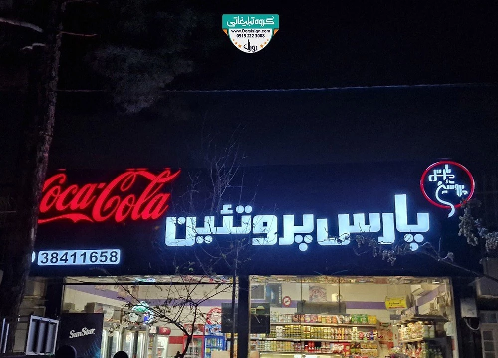 نصب و اجرای تابلو حروف برجسته چلنیوم یکی دیگر از نمونه کارهای انجام شده توسط گروه تابلوسازی دورال ساین می باشد. فروشگاه پارس پروتئین جهت زیباسازی، تبلیغات و اطلاع رسانی برای عموم مردم از تابلو چلنیوم و نما کامپوزیت برای نمای بیرونی خود استفاده کرده است. در تابلو مغازه پروتئینی سعی شده است از بهترین و جذاب ترین امکانات نظیر لامپ های اس ام دی، فلور سنت و نئونی استفاده شود. از امکانات این تابلو حروف برجسته چنلیوم و نما کامپوزیت می توان به نورپردازی زیبا، نصب راحت، قابل شستشو بودن، وزن و قیمت کم آن اشاره نمود.