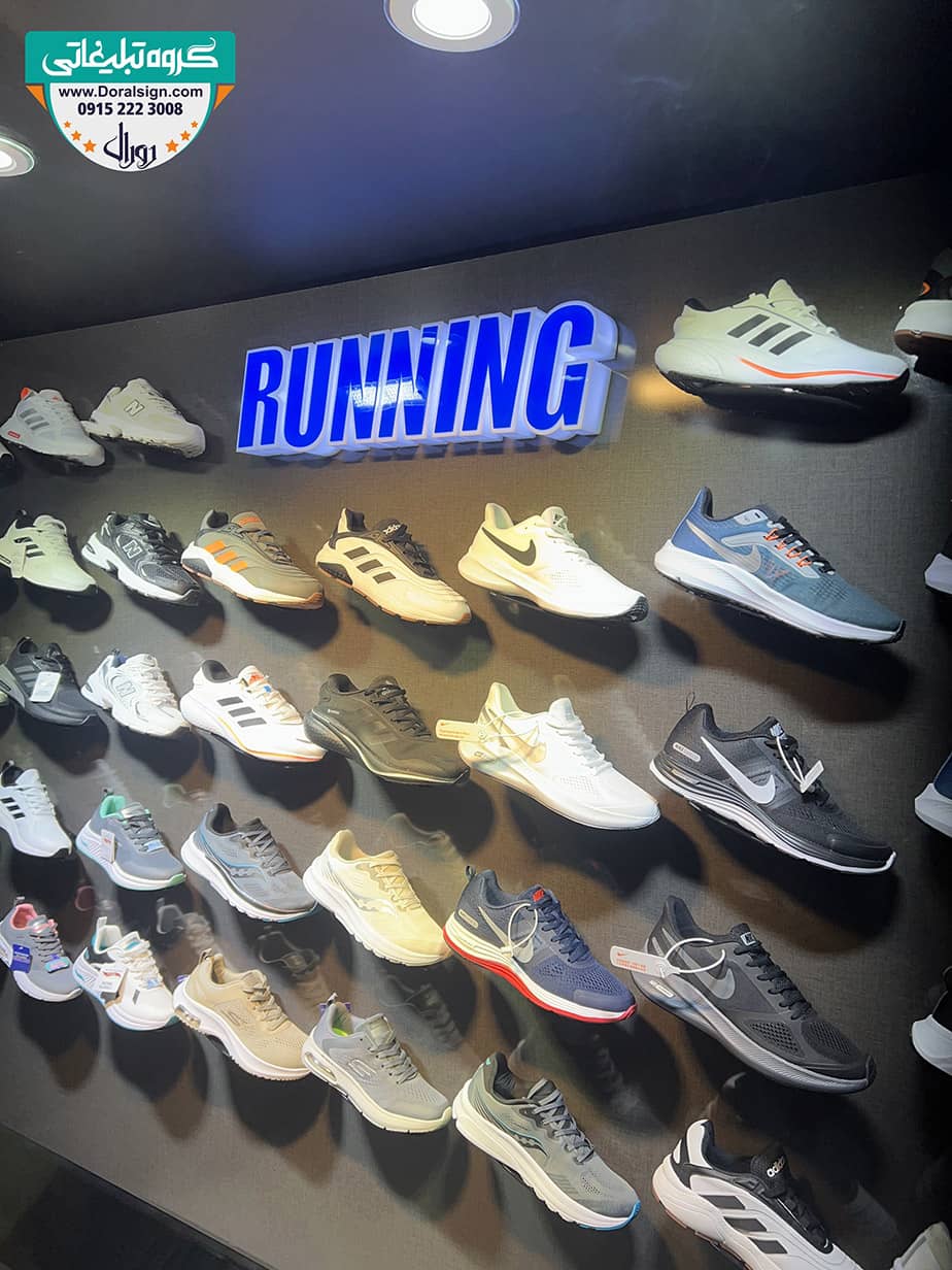 نصب و اجرای حروف برجسته پلاستیکی (پلکسی) یکی دیگر از نمونه کارهای انجام شده توسط شرکت تابلوسازی دورال ساین می باشد که این تابلوسازی در مشهد انجام پذیرفته است. فروشگاه Running جهت زیباسازی، تبلیغات و اطلاع رسانی برای عموم مردم از تابلو حروف پلکسی برای فروشگاه خود استفاده کرده است. در اجرا و نصب لوگو کفش فروشی سعی شده است از بهترین و جذاب ترین امکانات استفاده شود. از امکانات این تابلو حروف پلکسی می توان به تنوع رنگی بسیار بالا، قابلیت اجرا در انواع فونت ها، رنگ، هر نوع لوگو یا لوگو تایپ، ضد خش و ضد آب بودن آن اشاره نمود.