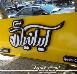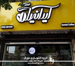 نصب و اجرای تابلو استیل طلایی و تابلو حروف فلزی برای کافی شاپ ایرانیا توسط گروه تابلوسازی دورال