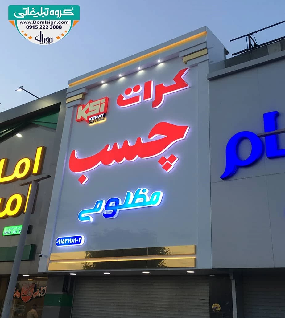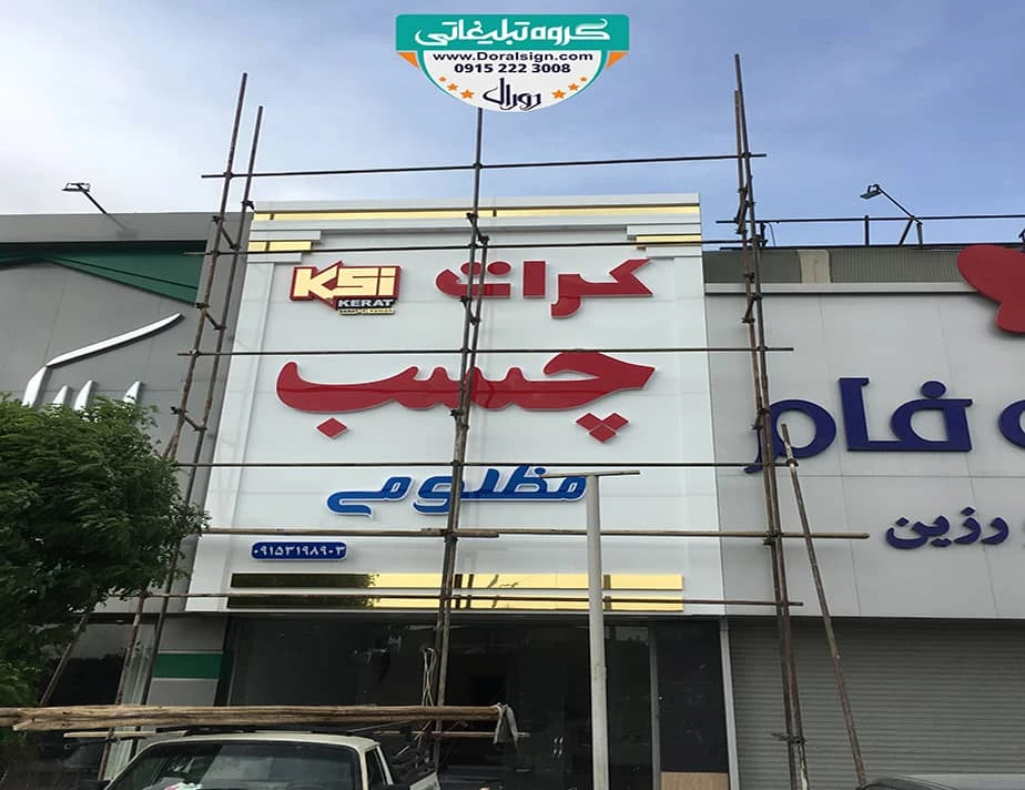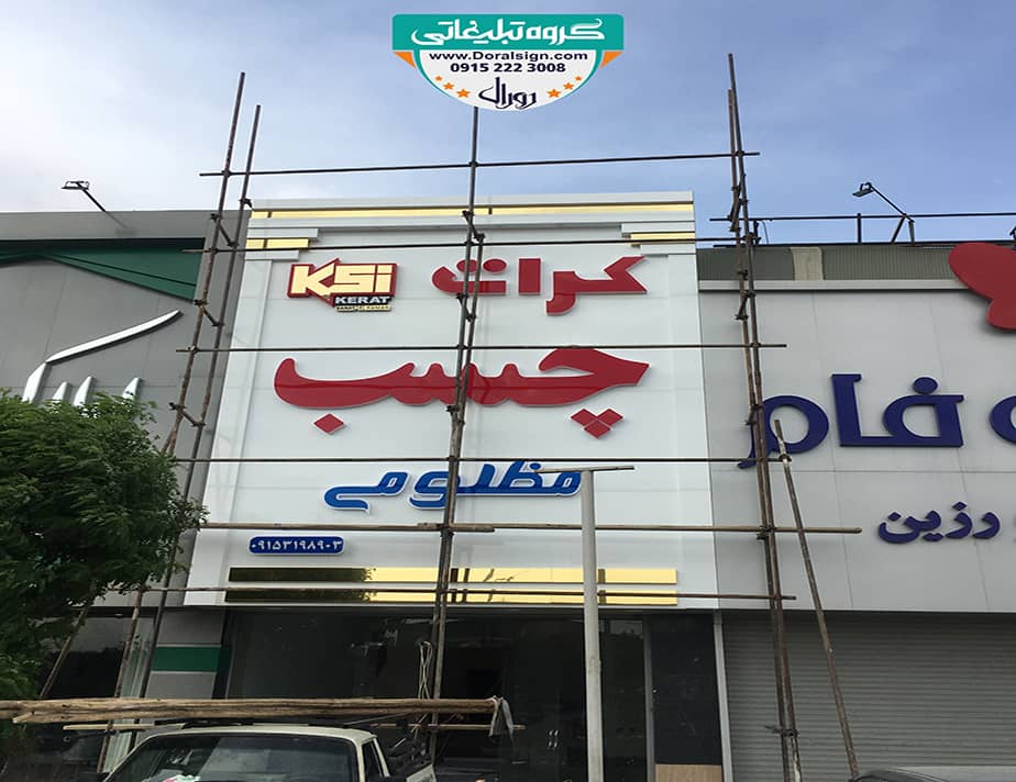 پروژه نصب و اجرای تابلو حروف برجسته پلاستیکی (پلکسی) و نما کامپوزیت برای مغازه کرات چسب مظلومی توسط تابلوسازی دورال
