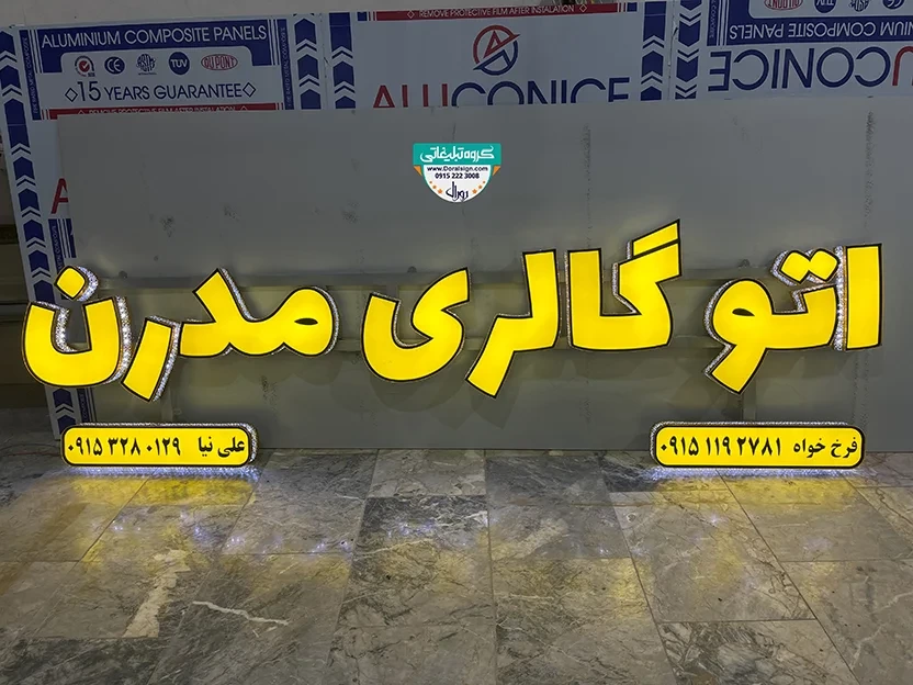 نصب و اجرای تابلو حروف برجسته چلنیوم یکی دیگر از نمونه کارهای انجام شده توسط گروه تابلوسازی دورال ساین می باشد که این پروژه تابلوسازی در مشهد انجام پذیرفته است. فروشگاه اتو گالری مدرن جهت زیباسازی، تبلیغات و اطلاع رسانی برای عموم مردم از تابلو چلنیوم مغازه برای نمای بیرونی خود استفاده کرده است. در تابلو سردر فروشگاه اتو گالری مدرن سعی شده است از بهترین و جذاب ترین امکانات نظیر لامپ های اس ام دی، فلور سنت و نئونی استفاده شود. از امکانات این تابلو حروف برجسته چنلیوم می توان به نورپردازی زیبا، نصب راحت، قابل شستشو بودن، وزن و قیمت کم آن اشاره نمود.