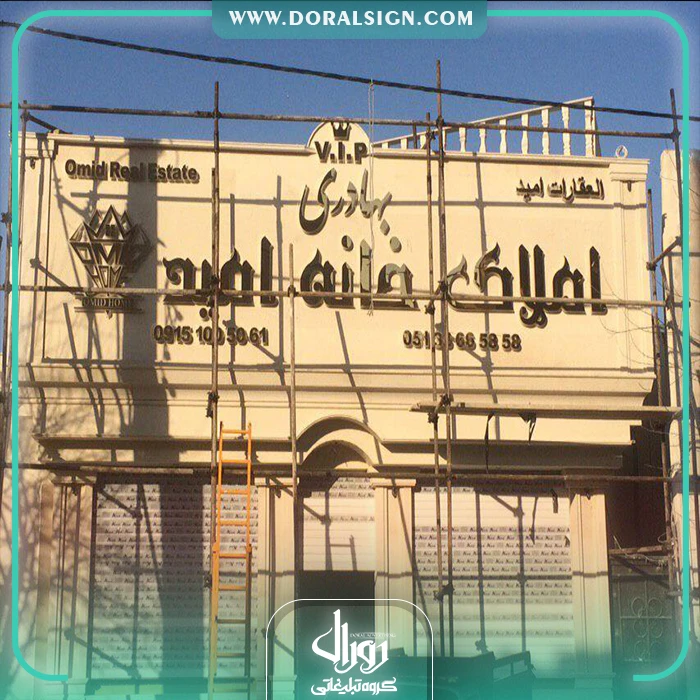 درباره پروژه نصب و اجرای تابلو استیل طلایی برای دفتراملاکی خانه امید توسط تابلوسازی دورال ساین