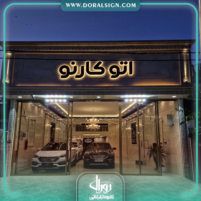 نمایشگاه خودرو اتو کارنو در مشهد واقع شده است که گروه تابلوسازی دورال مفتخر به نصب تابلو حروف فلزی برای این نمایشگاه ماشین می باشد.