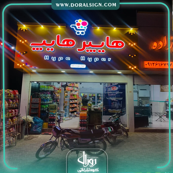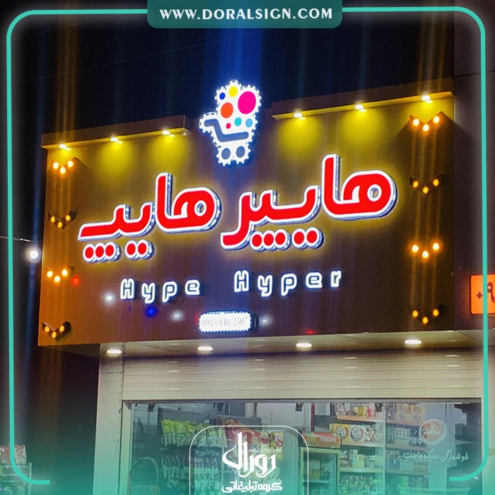 نصب و اجرای تابلو حروف برجسته چنلیوم و نمای کامپوزیت هایپر هایپ بر روی سردر مغازه یکی دیگر از نمونه کارهای انجام شده توسط گروه تابلوسازی دورال ساین می باشد. هایپر هایپ جهت تبلیغات و اطلاع رسانی برای عموم مردم از تابلو برجسته چلنیوم و نمای کامپوزیت استفاده کرده است. در تابلو سردر هایپر مارکت سعی شده است از بهترین و جذاب ترین امکانات نظیر لامپ های اس ام دی، فلور سنت و نئونی استفاده شود. از امکانات این تابلو حروف برجسته چنلیوم می توان به نورپردازی زیبا، نصب راحت، قابل شستشو بودن، وزن و قیمت کم آن اشاره نمود.