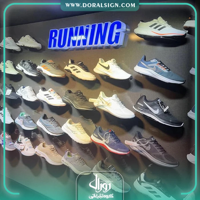 نصب و اجرای حروف برجسته پلاستیکی (پلکسی) یکی دیگر از نمونه کارهای انجام شده توسط شرکت تابلوسازی دورال ساین می باشد که این تابلوسازی در مشهد انجام پذیرفته است. فروشگاه Running جهت زیباسازی، تبلیغات و اطلاع رسانی برای عموم مردم از تابلو حروف پلکسی برای فروشگاه خود استفاده کرده است. در اجرا و نصب لوگو کفش فروشی سعی شده است از بهترین و جذاب ترین امکانات استفاده شود. از امکانات این تابلو حروف پلکسی می توان به تنوع رنگی بسیار بالا، قابلیت اجرا در انواع فونت ها، رنگ، هر نوع لوگو یا لوگو تایپ، ضد خش و ضد آب بودن آن اشاره نمود.