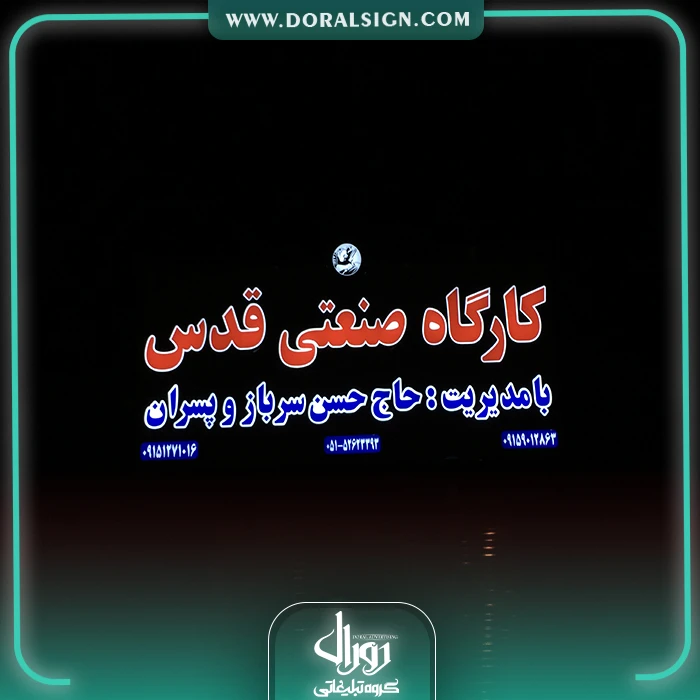 نصب و اجرای تابلو حروف برجسته چلنیوم و نمای کامپوزیت مغازه یکی دیگر از نمونه کارهای انجام شده توسط گروه تابلوسازی دورال ساین می باشد که این پروژه تابلوسازی در مشهد انجام پذیرفته است. کارگاه صنعتی قدس جهت زیباسازی، تبلیغات و اطلاع رسانی برای عموم مردم از تابلو چلنیوم و نمای کامپوزیت مغازه برای سردر نمای بیرونی خود استفاده کرده است. در تابلو سردر کارگاه سعی شده است از بهترین و جذاب ترین امکانات نظیر لامپ های اس ام دی، فلورسنت و نئونی استفاده شود. از امکانات این تابلو حروف برجسته چنلیوم و کامپوزیت نمای مغازه می توان به نورپردازی زیبا، نصب راحت، قابل شستشو بودن، وزن و قیمت کم آن اشاره نمود. برای سفارش تابلو می توانید با ما در تماس باشید.