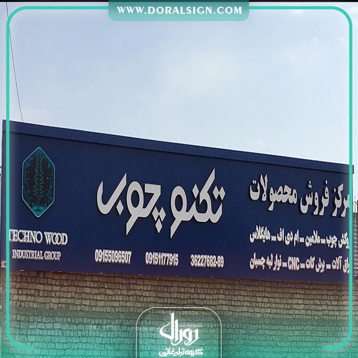 نصب و اجرای تابلو حروف برجسته چنلیوم یکی دیگر از نمونه کارهای انجام شده توسط گروه تابلوسازی دورال ساین می باشد. مرکز فروش محصولات تکنو چوب از تابلو چنلیوم جهت زیباسازی، تبلیغات و اطلاع رسانی برای عموم مردم در سردر نمای بیرونی خود استفاده کرده است. در تابلو سردر کارگاه چوب بری سعی شده است از بهترین و جذاب ترین امکانات نظیر لامپ های اس ام دی، فلورسنت و نئونی استفاده شود. از امکانات این تابلو حروف برجسته چنلیوم می توان به نورپردازی زیبا، نصب راحت، قابل شستشو بودن، وزن و قیمت کم آن اشاره نمود. برای اطلاع از قیمت تابلو حروف برجسته می توانید با ما در ارتباط باشید.