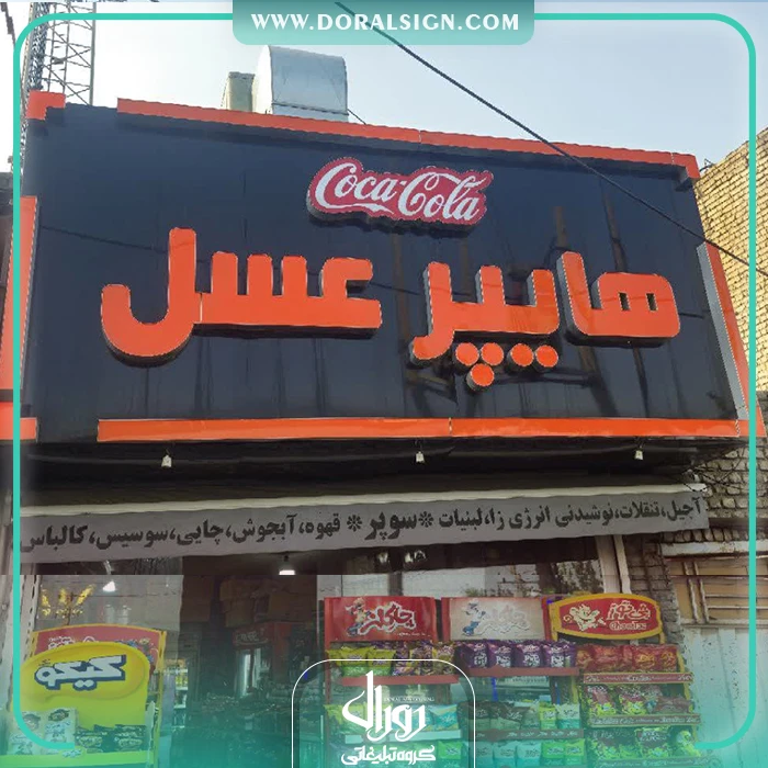 نصب و اجرای تابلو حروف برجسته چلنیوم یکی دیگر از نمونه کارهای انجام شده توسط گروه تابلوسازی دورال ساین می باشد. فروشگاه هایپر عسل جهت زیباسازی، تبلیغات و اطلاع رسانی برای عموم مردم از تابلو چلنیوم و نما کامپوزیت برای نمای بیرونی خود استفاده کرده است. در تابلو سردر هایپر مارکت عسل سعی شده است از بهترین و جذاب ترین امکانات نظیر لامپ های اس ام دی، فلور سنت و نئونی استفاده شود. از امکانات این تابلو حروف برجسته چنلیوم و نما کامپوزیت می توان به نورپردازی زیبا، نصب راحت، قابل شستشو بودن، وزن و قیمت کم آن اشاره نمود. برای اطلاع از قیمت تابلو سوپرمارکت کلیک کنید.