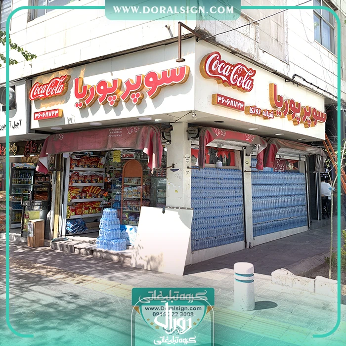 نصب و اجرای تابلو حروف برجسته چلنیوم یکی دیگر از نمونه کارهای انجام شده توسط گروه تابلوسازی دورال ساین می باشد. فروشگاه سوپر پوریا جهت زیباسازی، تبلیغات و اطلاع رسانی برای عموم مردم از تابلو چلنیوم و نما کامپوزیت برای نمای بیرونی خود استفاده کرده است. در تابلو سوپرمارکت سعی شده است از بهترین و جذاب ترین امکانات نظیر لامپ های اس ام دی، فلور سنت و نئونی استفاده شود. از امکانات این تابلو حروف برجسته چنلیوم و نما کامپوزیت می توان به نورپردازی زیبا، نصب راحت، قابل شستشو بودن، وزن و قیمت کم آن اشاره نمود.