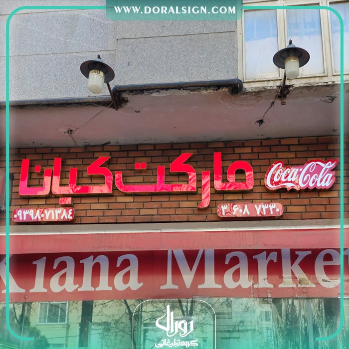 نصب و اجرای تابلو حروف برجسته چلنیوم یکی دیگر از نمونه کارهای انجام شده توسط گروه تابلوسازی دورال ساین می باشد. فروشگاه سوپر مارکت کیانا جهت زیباسازی، تبلیغات و اطلاع رسانی برای عموم مردم از تابلو چلنیوم و نما چوب برای نمای بیرونی خود استفاده کرده است. در تابلو سوپری سعی شده است از بهترین و جذاب ترین امکانات نظیر لامپ های اس ام دی، فلور سنت و نئونی استفاده شود. از امکانات این تابلو حروف برجسته چنلیوم و نما چوب می توان به نورپردازی زیبا، نصب راحت، قابل شستشو بودن، وزن و قیمت کم آن اشاره نمود.