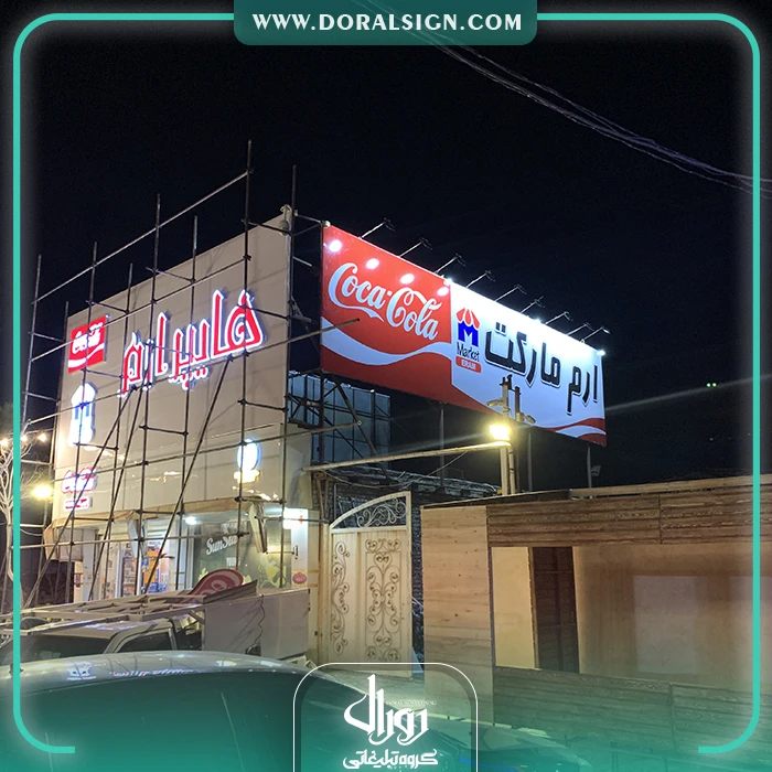 نصب و اجرای تابلو حروف برجسته چلنیوم یکی دیگر از نمونه کارهای انجام شده توسط گروه تابلوسازی دورال ساین می باشد. ارم مارکت جهت زیباسازی، تبلیغات و اطلاع رسانی برای عموم مردم از تابلو چلنیوم برای نمای بیرونی خود استفاده کرده است. در تابلو سوپری سعی شده است از بهترین و جذاب ترین امکانات نظیر لامپ های اس ام دی، فلور سنت و نئونی استفاده شود. از امکانات این تابلو حروف برجسته چنلیوم و فلکسی می توان به نورپردازی زیبا، نصب راحت، قابل شستشو بودن، وزن و قیمت کم آن اشاره نمود.