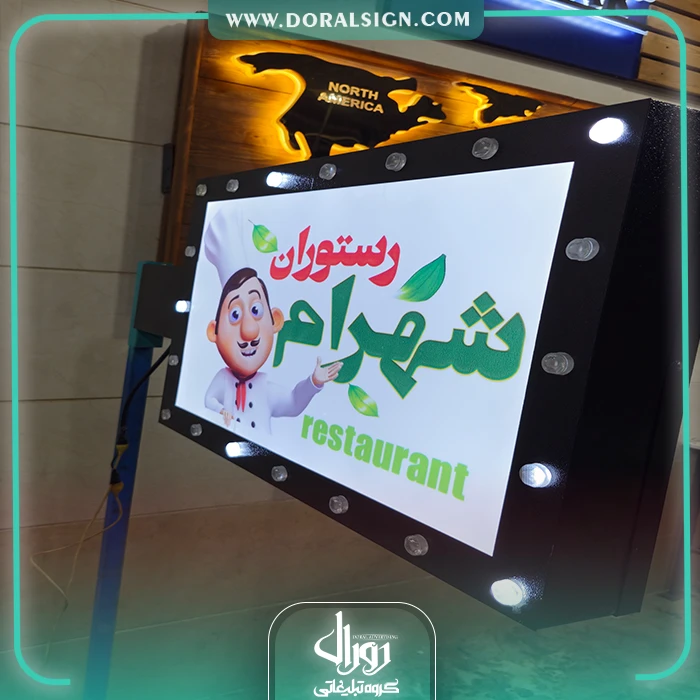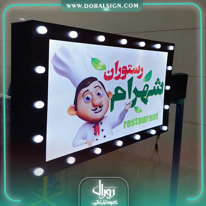 * ورق آهن 1 میلیمتر * لبه کار ورق اهن 0/8 میلیمتر * رنگ کوره ای الکترو استاتیک خارجی * ورق پلکسی تایوان مقاوم دربرابر آفتاب شدید * ال ای دی درجه یک مخصوص لایت باکس با طول عمر بال