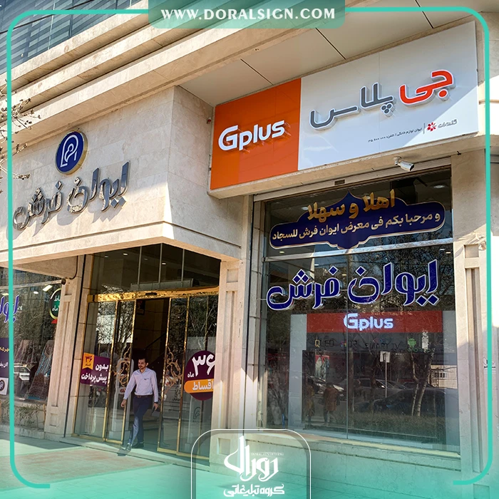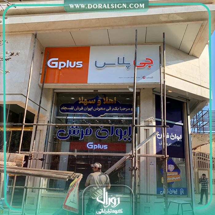 گروه تابلوسازی دورال مفتخر به نصب و اجرای تابلو کامپوزیت چنلیوم برای شرکت جی پلاس فروشگاه ایوان فرش واقع در مجد مشهد می باشد.